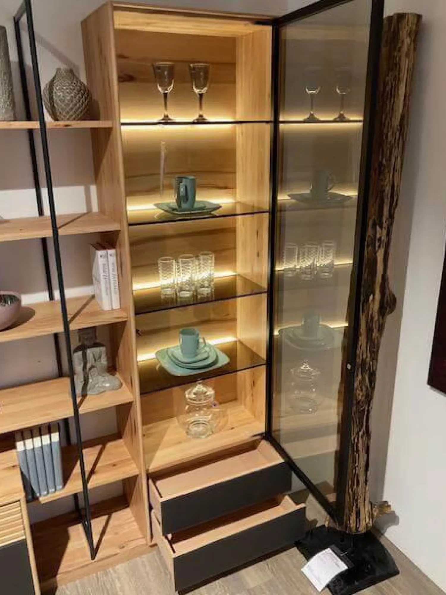 Front: Naturbuche Massiv gebürstet und hell geölt & Glas matt Zartbitter