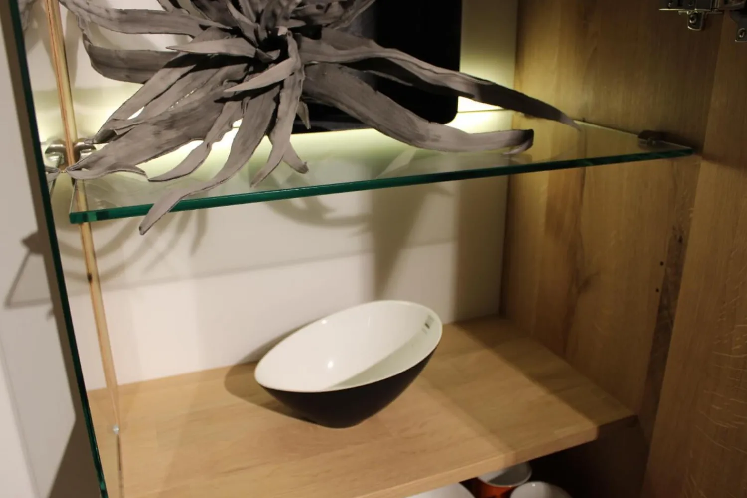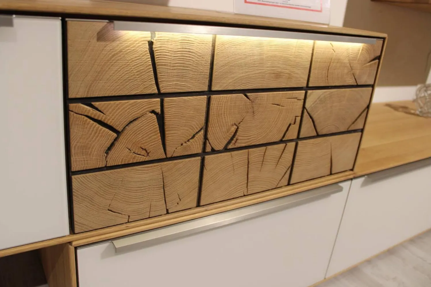 Farbbezeichnung des Herstellers: Asteiche massiv,bianco geölt und gebürstet Hirnholz / Front-Akzent Glas schlamm satiniert