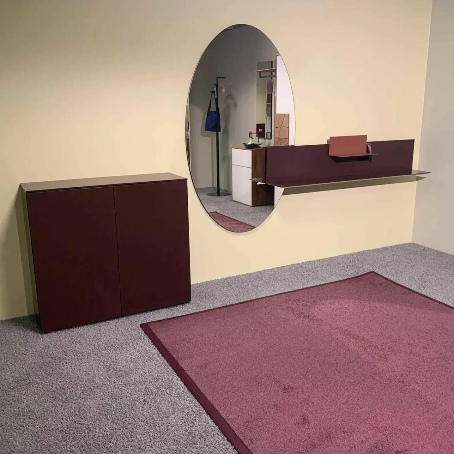Front: Schuhschrank, Trägerplatte Spiegel und Regal 160cm Lack matt burgund, Regal 40cm Lack matt malve