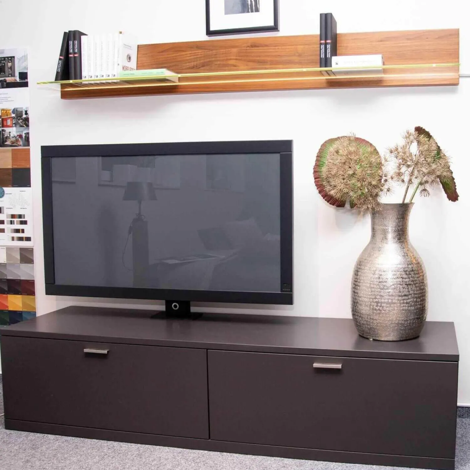 Tiefe: Regal: 18, TV-Sideboard: 50, Vitrinenschrank: 120 cm