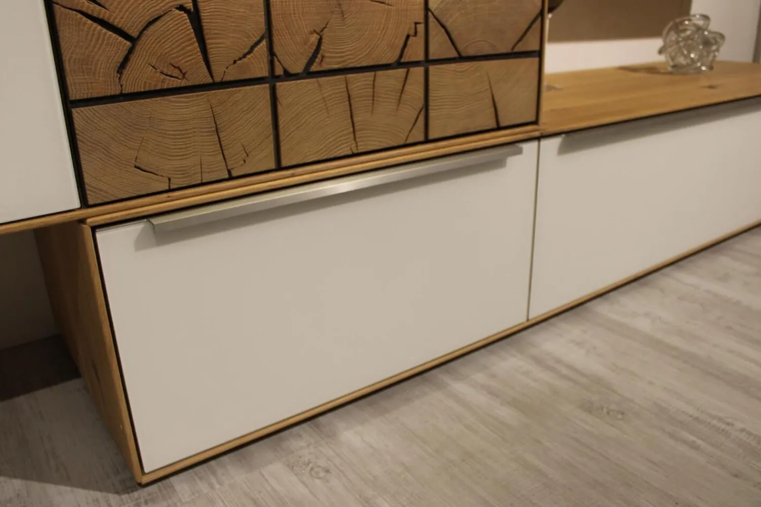 Farbbezeichnung des Herstellers: Asteiche massiv,bianco geölt und gebürstet Hirnholz / Front-Akzent Glas schlamm satiniert