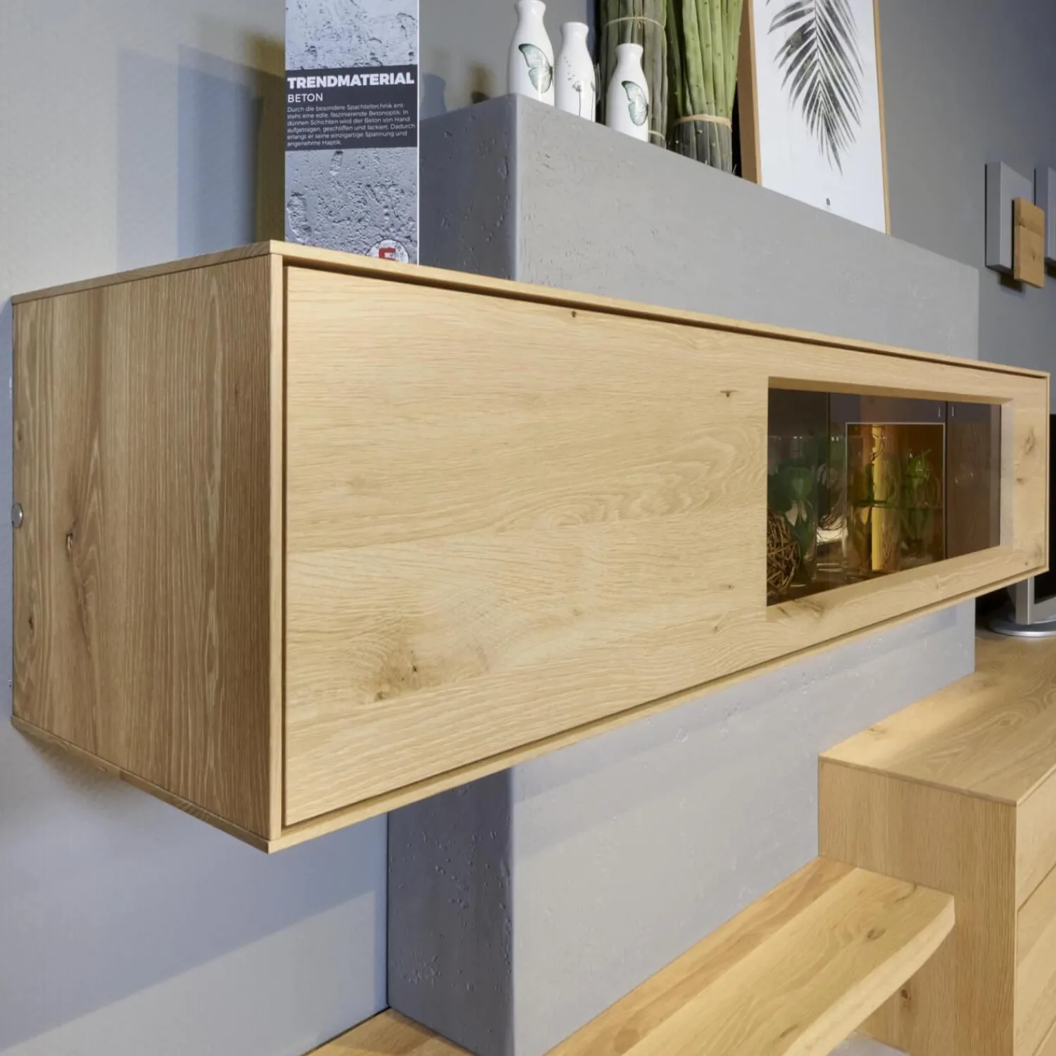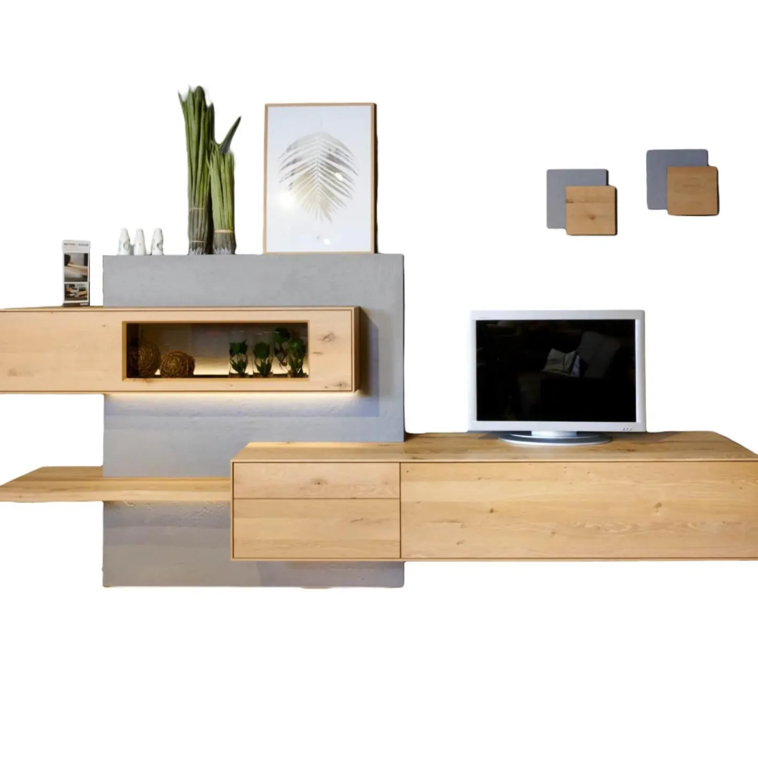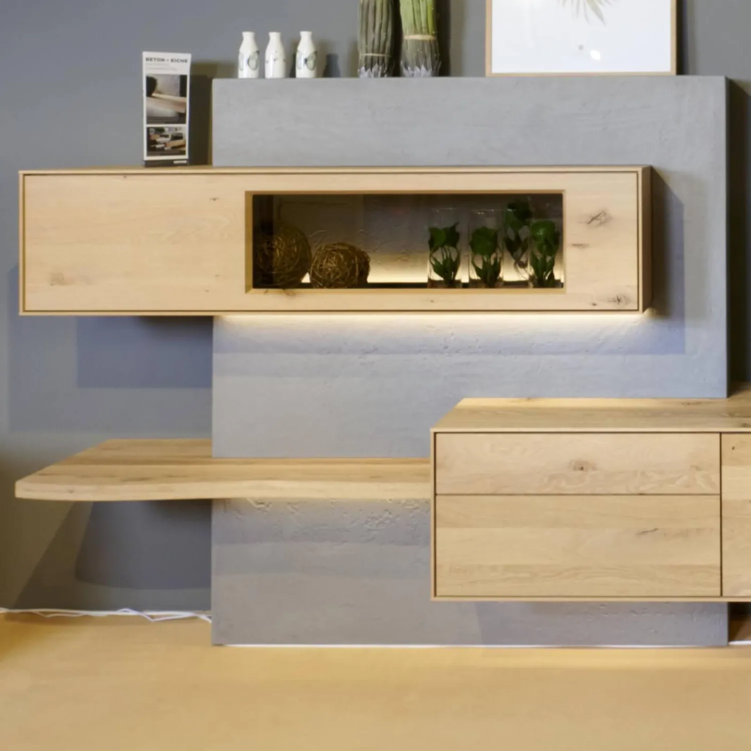 Lieferumfang: 1 Wohnwand bestehend aus:1 Betonbaustein, 1 Hängevitrine, 1 Hängelowboard, 2 Wandleuchten