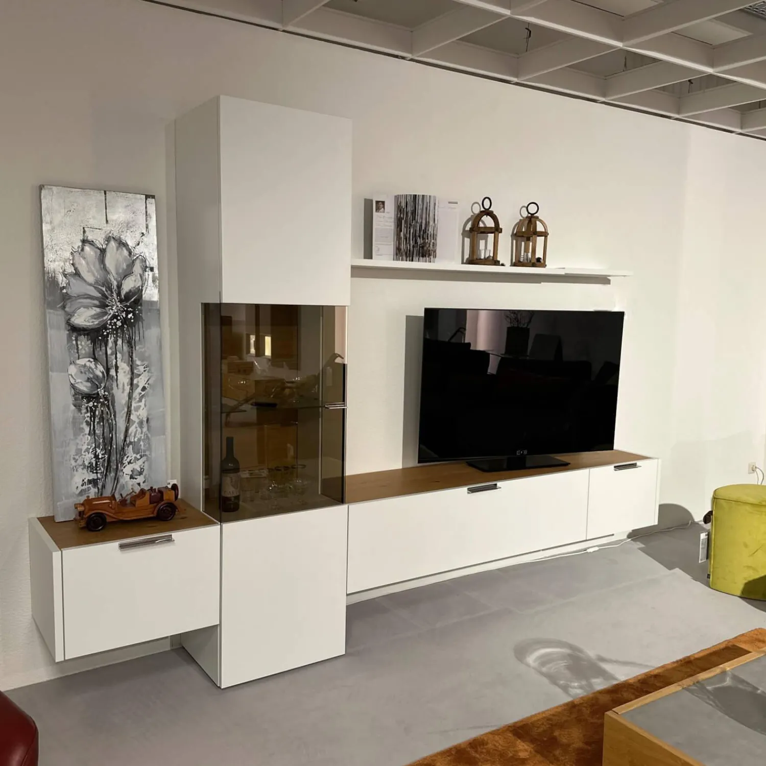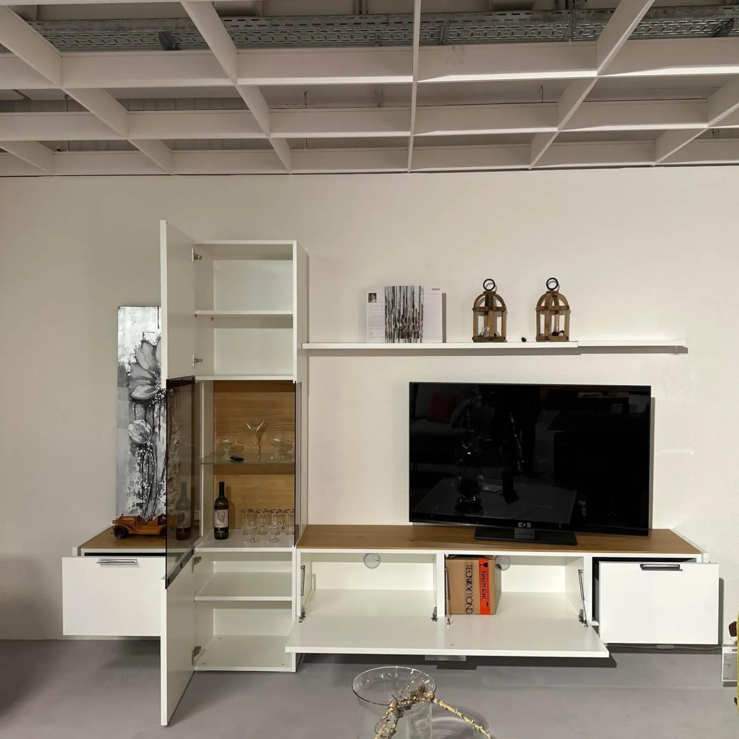 Breite: Gesamt: 305 Lowboard Links: 55.7 Vitrine: 52.8 Lowboard Rechts: 196.5 Wandsteckbord 1: 140.8 Wandsteckbord 2: 52.8 cm