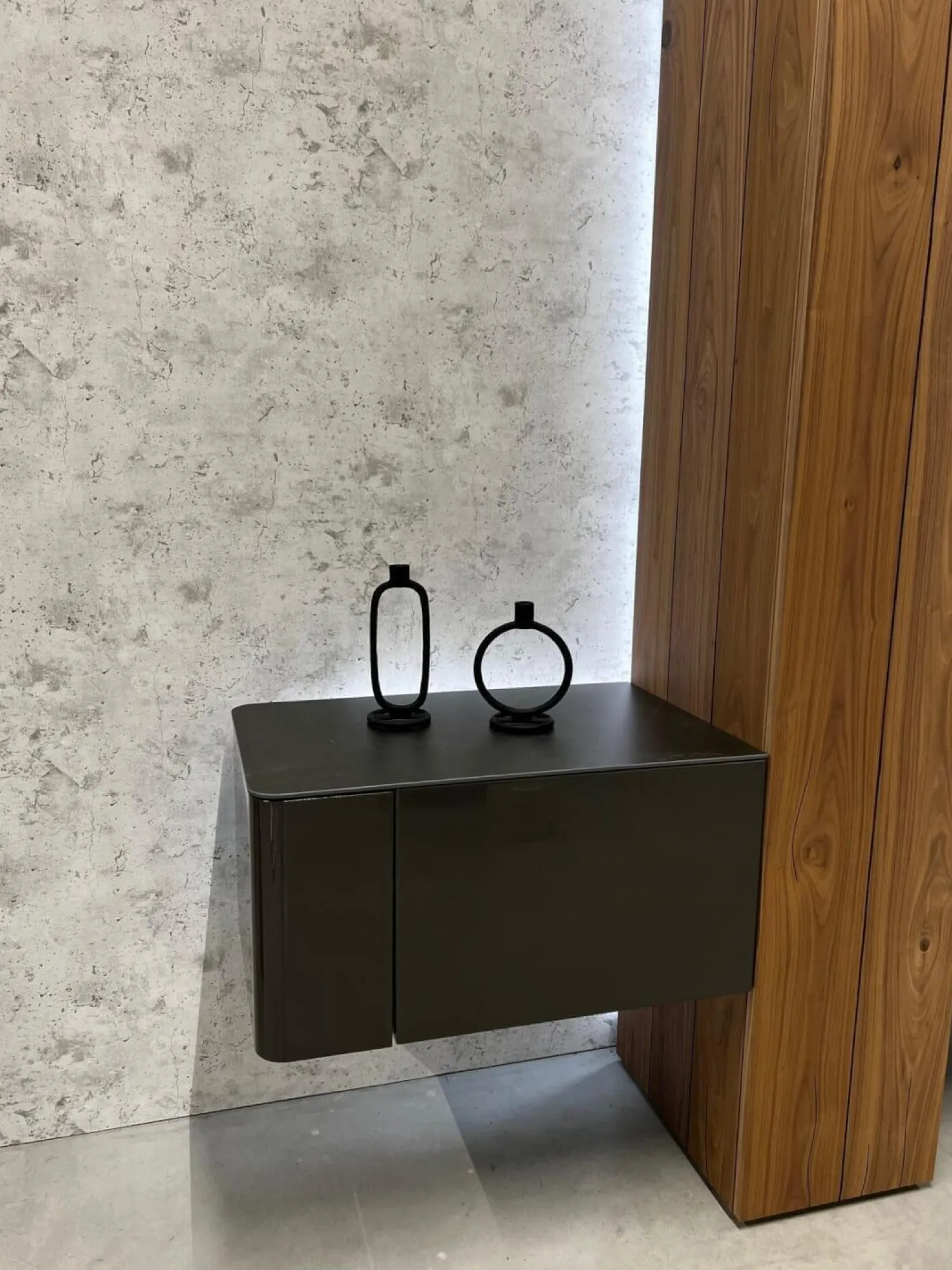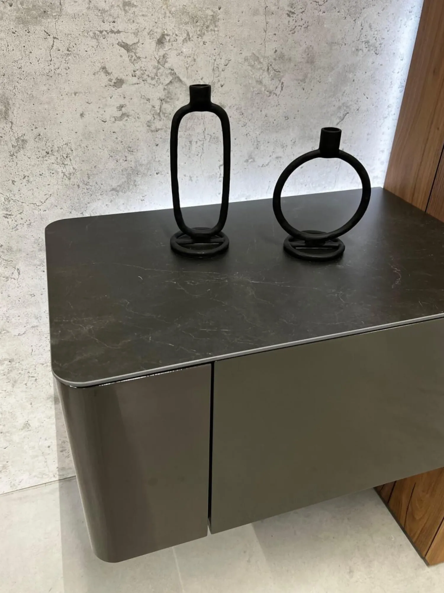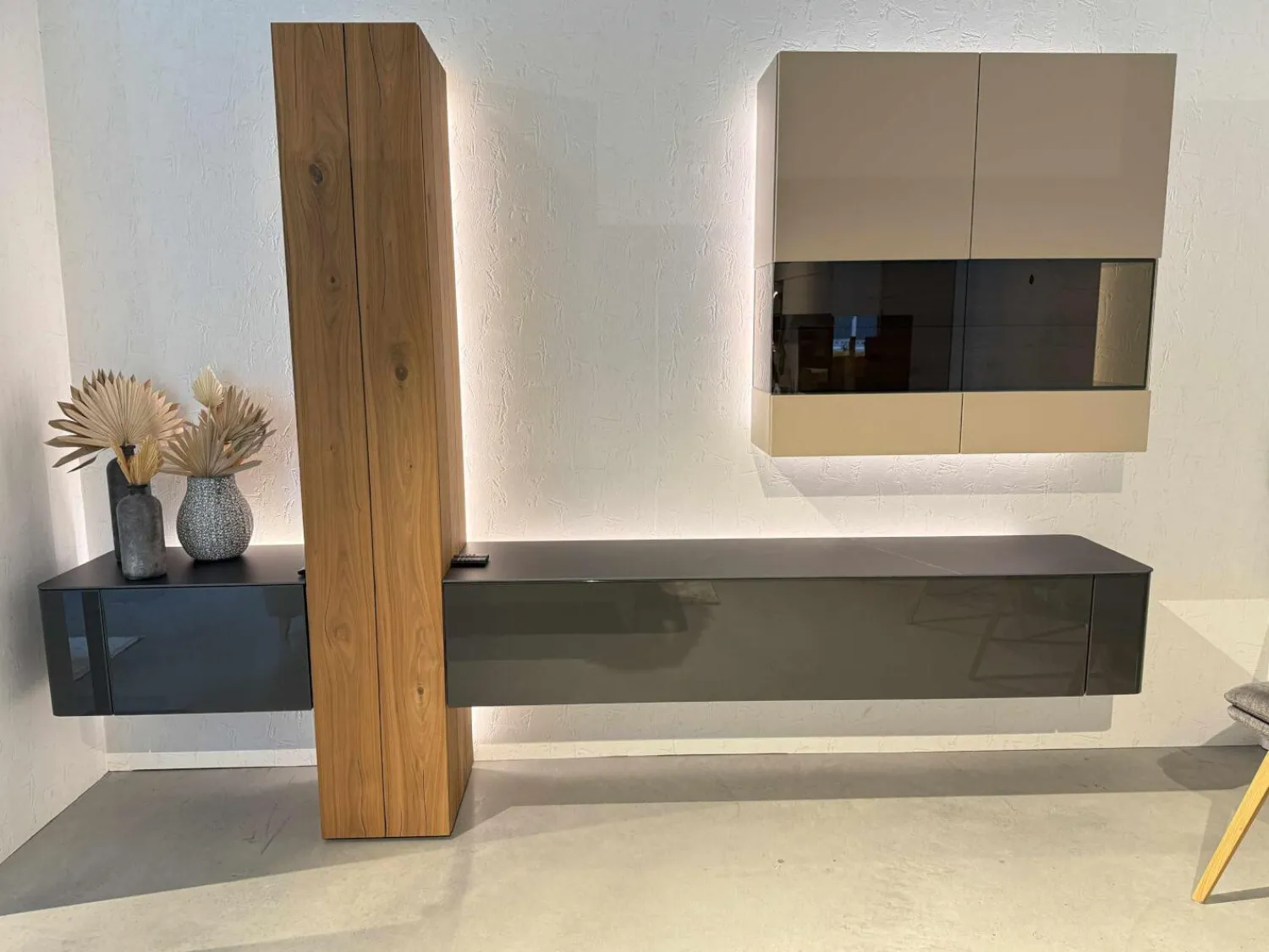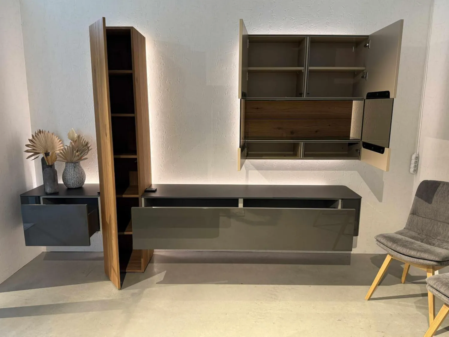 Farbbezeichnung des Herstellers: Lack HGL-seidengrau, Keramik Storm nero, Kernnussbaum Naturstamm, NCS S4010-Y30R