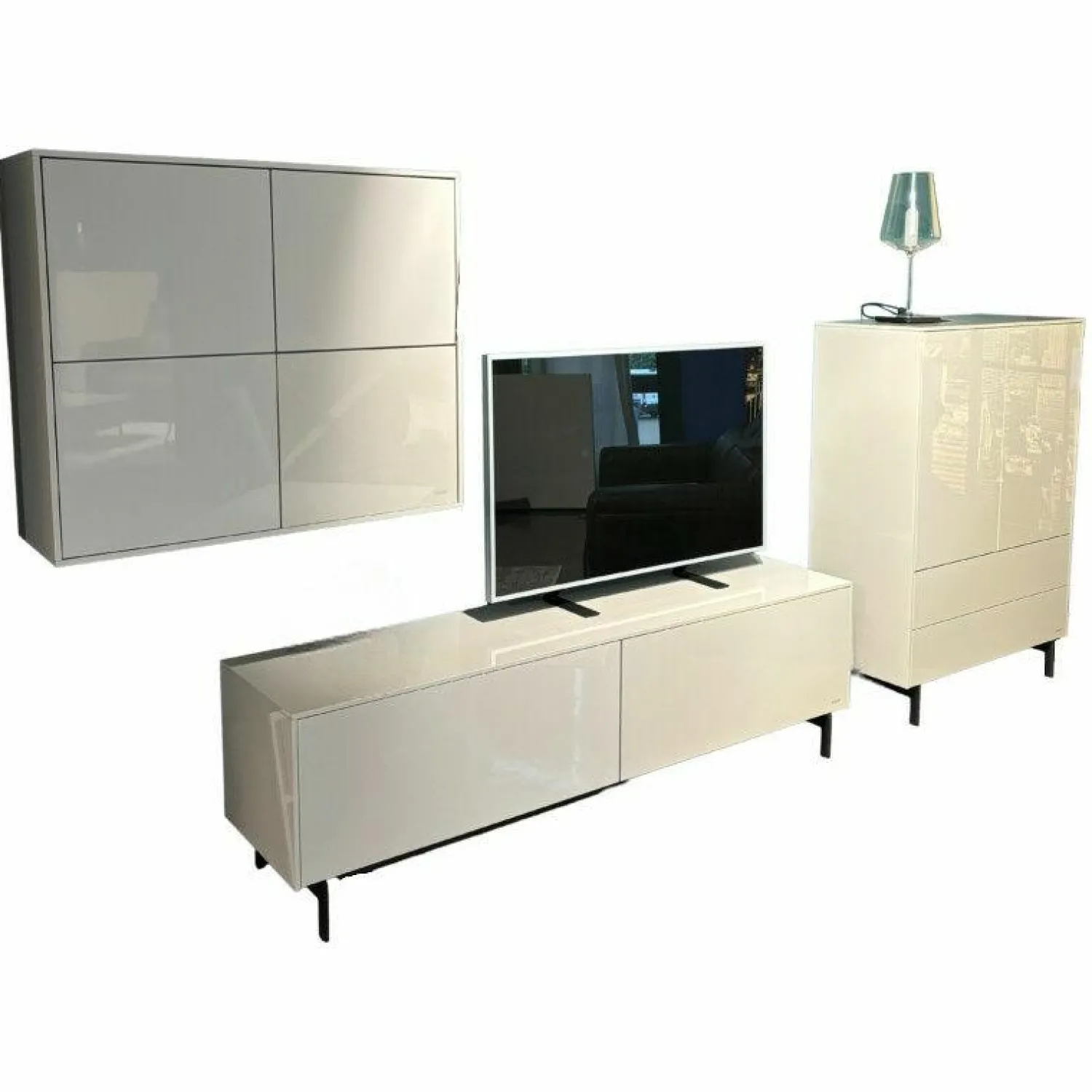 1x Hängeschrank mit 4 Türen B/H/T: ca. 93 x 80 x 331x Lowboard mit Beleuchtung B/H/T: ca. 183 x 55 x 43 cm1 x Highboard mit 2 Türen inkl. Beleuchtung B/H/T: ca. 93 x 132 x 43 cm
